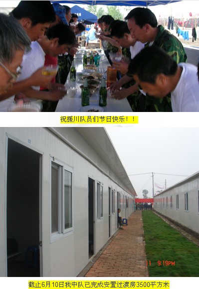 6月11日,大地建設(shè)中隊已經(jīng)轉(zhuǎn)場投入到更加艱巨的5600平方米的災(zāi)區(qū)幼兒園安置過渡房建設(shè)工作中去,迎接新的挑戰(zhàn)。