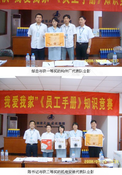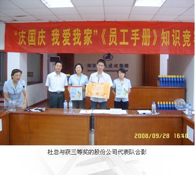 2008年9月28日,國慶長假前的最后一個工作日,公司工會組織了一場別開生面的“慶國慶,我愛我家,《員工守則》知識競賽” 活動,寓教于樂,現(xiàn)場氣氛熱烈。集團(tuán)選拔了集團(tuán)機關(guān)、股份公司、構(gòu)件廠、房地產(chǎn)公司等十支代表隊參賽;顒佑晒飨瘲钊缑髦鞒,公司領(lǐng)導(dǎo)董事長于國家、黨委書記陳慶生、常務(wù)副總鄒志堅等參加了本次活動。