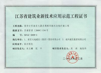 我公司承建的“侵華日軍南京大屠殺遇難同胞紀(jì)念館擴(kuò)建工程”于09年下半年通過了第六批全國建筑業(yè)新技術(shù)應(yīng)用示范工程的專家評審,結(jié)論為:應(yīng)用新技術(shù)的整體水平達(dá)到“國內(nèi)領(lǐng)先水平”。另外,本工程還被江蘇省建管局批準(zhǔn)為“江蘇省第一批綠色施工示范工程”。該工程應(yīng)用了建設(shè)部“建筑業(yè)十項新技術(shù)”的10大項17小項,江蘇省新技術(shù)4項,創(chuàng)新技術(shù)3項。該工程于近日取得了“江蘇省建筑業(yè)新技術(shù)應(yīng)用示范工程證書”。 |