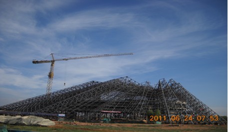 近日,由股份公司承建的成吉思汗博物館工程鋼結(jié)構(gòu)主體部分已順利完工,目前已進入屋面防水保溫施工及外墻石材玻璃幕墻施工階段。該博物館投影形狀為成吉思汗征戰(zhàn)的版圖,外立面三十九個折面的數(shù)量體現(xiàn)了成吉思汗下屬的各個小汗國的數(shù)量,高低起伏、錯落有致的外形,象征著成吉思汗一生的坎坷,十三條山脊描繪出成吉思汗以鄂爾多斯為中心向十三個方向的進攻的路線。由于該工程運用的鋼結(jié)構(gòu)造型獨特,為國內(nèi)首個折板網(wǎng)殼復雜屋蓋鋼結(jié)構(gòu),沒有經(jīng)驗可循,而且運用的材料規(guī)格、品種繁多,從拼裝到適應當?shù)鬲毺氐臍夂,對項目部來說都是一種全新的挑戰(zhàn)。