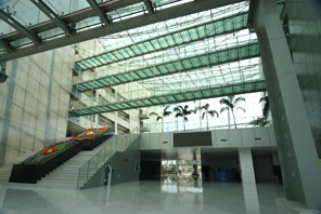 工程中廳單元采光平頂和玻璃幕墻為鋼桁架和索組合結(jié)構(gòu),玻璃幕墻和采光頂下安裝電動式遮陽卷簾。卷簾采用新型高效環(huán)保透視薄膜,可阻擋強(qiáng)光、紫外線, 隔熱保溫節(jié)能。東西采光屋面玻璃采光平頂,為技術(shù)先進(jìn)的預(yù)應(yīng)力單向索桁架結(jié)構(gòu),  輕盈美觀,晶瑩通透。東、西辦公區(qū)域之間橫跨一座30m長三層懸索玻璃天橋,點綴建筑空間,橋面及兩側(cè)欄板均由鋼化夾膠玻璃與不銹鋼構(gòu)件等現(xiàn)代建筑材料組成,設(shè)計巧妙,簡潔明快。大廳內(nèi)16只紅外線煙感發(fā)射器與內(nèi)部的消防系統(tǒng)聯(lián)動。地下車庫的消防噴淋系統(tǒng)采用上噴式噴頭,增大了消防面積;辦公大廳及走廊部分則采用暗式噴頭,美觀實用。景觀給水系統(tǒng)采用不銹鋼管快速卡壓的新型連接方式。電氣系統(tǒng)采用新穎的封閉母排敷設(shè)至相關(guān)區(qū)域;防雷接地引下線則利用了工程的結(jié)構(gòu)鋼柱作為接地引下線。智能建筑應(yīng)用了目前世界上先進(jìn)的網(wǎng)絡(luò)數(shù)字技術(shù),通過優(yōu)化設(shè)計的星型綜合布線結(jié)構(gòu),利用高速、高抗干擾的光纖電纜設(shè)施,使大樓具多媒體遠(yuǎn)程會議、中心遠(yuǎn)程監(jiān)控報警、智能門禁、自動化辦公等現(xiàn)代化綜合功能。 |