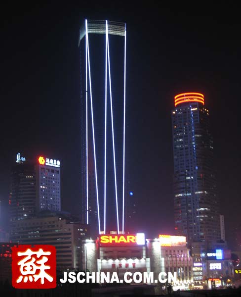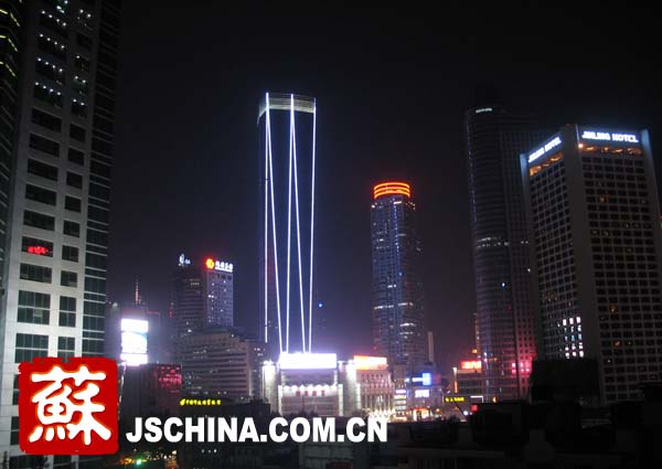 位于南京市中心的新百新大樓在夜晚發(fā)出璀璨的光芒,點(diǎn)綴著南京的夜空。