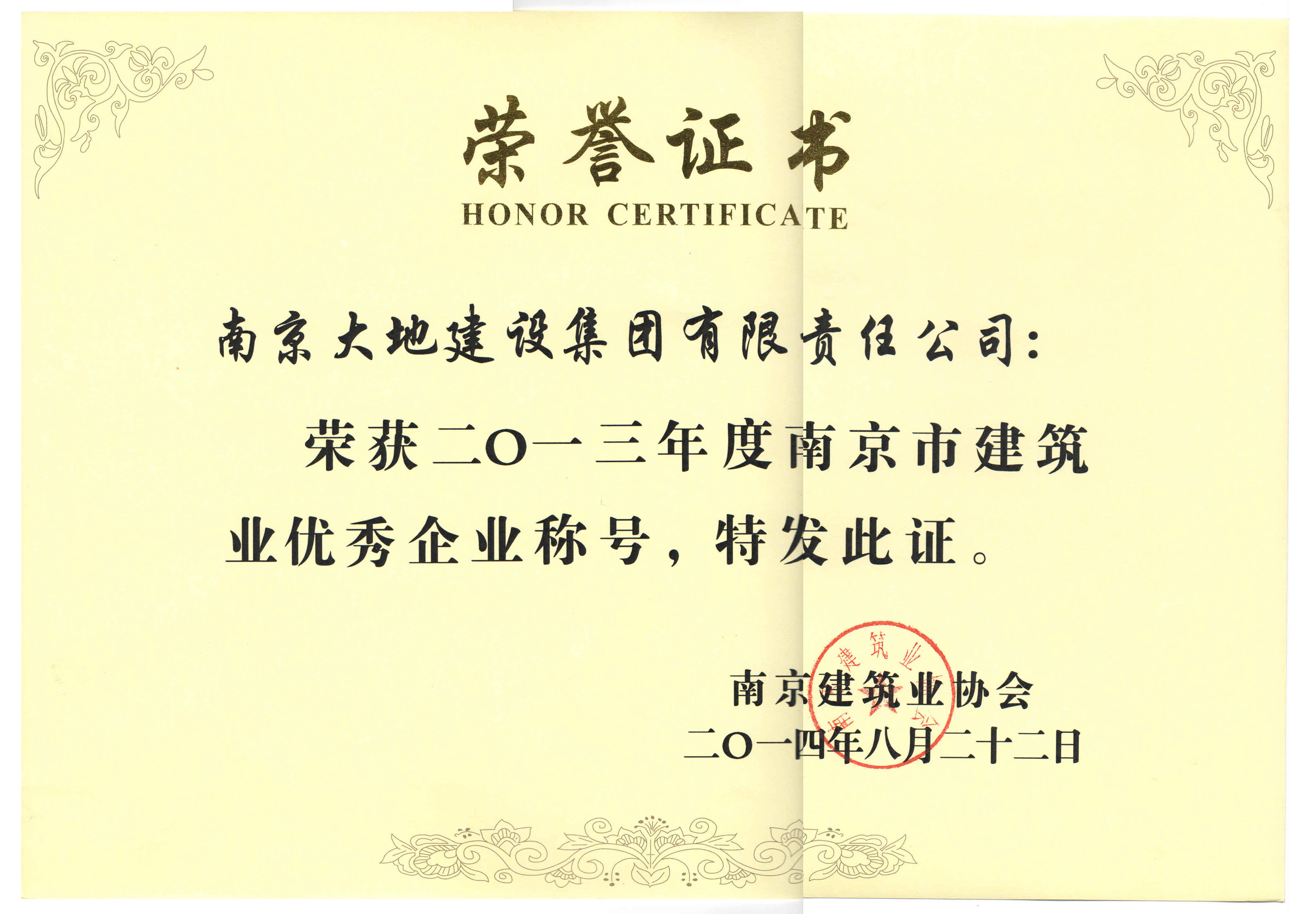 2013年度南京市建筑業(yè)“優(yōu)秀企業(yè)”評選工作已經(jīng)結(jié)束,在南京市建筑業(yè)協(xié)會協(xié)會審核、考評,并通過評委會審定后, 南京大地建設(shè)集團(tuán)有限責(zé)任公司等46家施工企業(yè)榮獲2013年度南京市建筑業(yè)“優(yōu)秀企業(yè)”稱號。