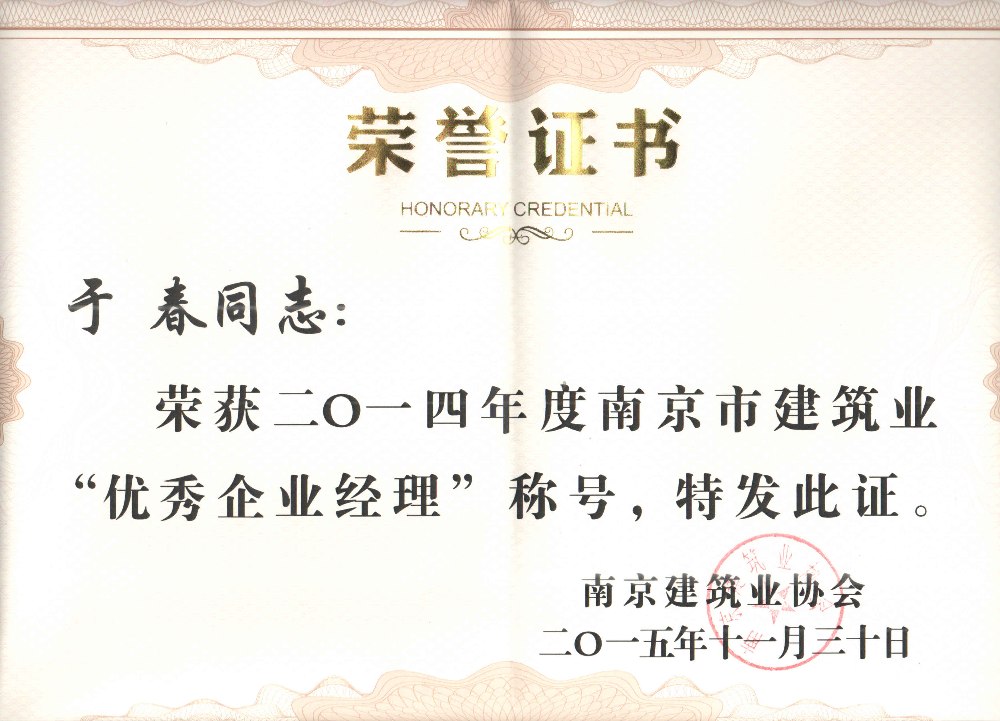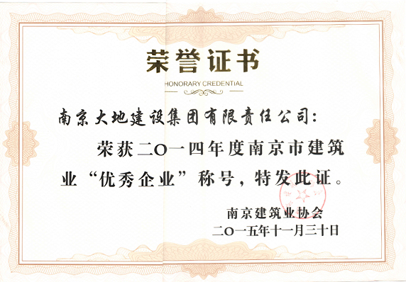 2016年3月1日,南京市建筑業(yè)協(xié)會(huì)隆重召開七屆三次理事會(huì)暨2015年度總結(jié)表彰大會(huì),表彰主動(dòng)適應(yīng)新常態(tài),推動(dòng)行業(yè)新發(fā)展,為加強(qiáng)南京市建筑業(yè)企業(yè)品牌建設(shè)做出貢獻(xiàn)的企業(yè)和企業(yè)經(jīng)理。南京大地建設(shè)集團(tuán)有限責(zé)任公司和南京大地建設(shè)(集團(tuán))股份有限公司被授予南京市建筑業(yè)“優(yōu)秀企業(yè)”榮譽(yù)稱號(hào),集團(tuán)公司副總裁于春榮獲南京市建筑業(yè)“優(yōu)秀企業(yè)經(jīng)理”榮譽(yù)稱號(hào)。