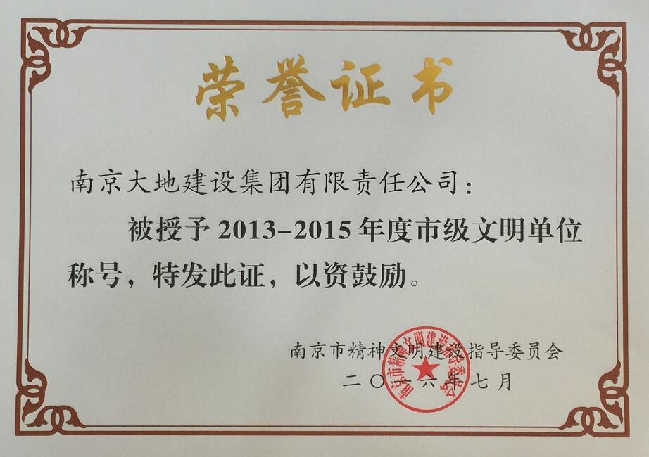 2013年以來,公司在黨的十八大和十八屆三中、四中、五中全會精神的指引下,公司全體員工團(tuán)結(jié)一致,努力貫徹落實(shí)科學(xué)發(fā)展觀。在黨建工作、精神文明建設(shè)工作和企業(yè)文化建設(shè)工作中取得了可喜的成績。經(jīng)相關(guān)部門評審,集團(tuán)公司再次獲得江蘇省精神文明建設(shè)指導(dǎo)委員會頒發(fā)的2013-2015年度“江蘇省文明單位”稱號和南京市委、市政府頒發(fā)的2013-2015年度“南京市文明單位”稱號。