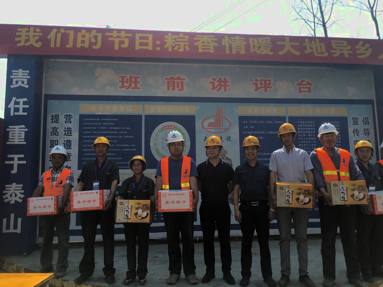 端午節(jié)前夕,集團公司就“我們的節(jié)日·粽香情暖大地異鄉(xiāng)人”為主題開展了端午慰問施工現(xiàn)場人員的活動,并準備了粽子、咸鴨蛋等慰問物品。5月27日下午由集團公司總裁江中明及黨委書記陳慶生同志帶隊,股份公司相關領導陪同前往浦口區(qū)橋林柳岸聽鶯景苑小區(qū)保障房工地對工作在一線的員工進行了慰問,親手送上節(jié)日慰問品,轉達了集團公司的問侯和祝福。總裁還仔細檢查施工現(xiàn)場并詢問了工程進展情況、人員的生活情況,關心大家要注意勞逸結合,注重安全生產(chǎn)。