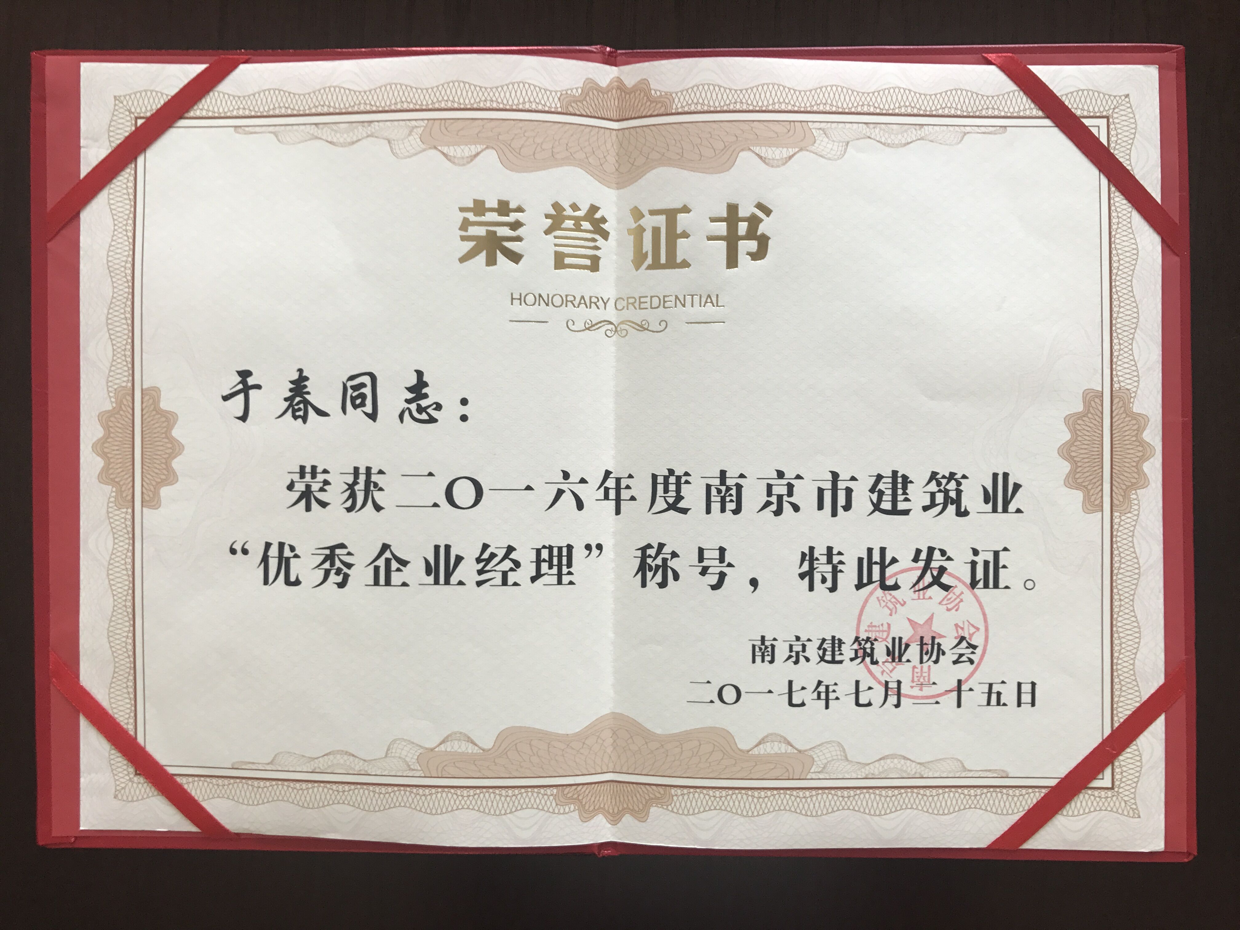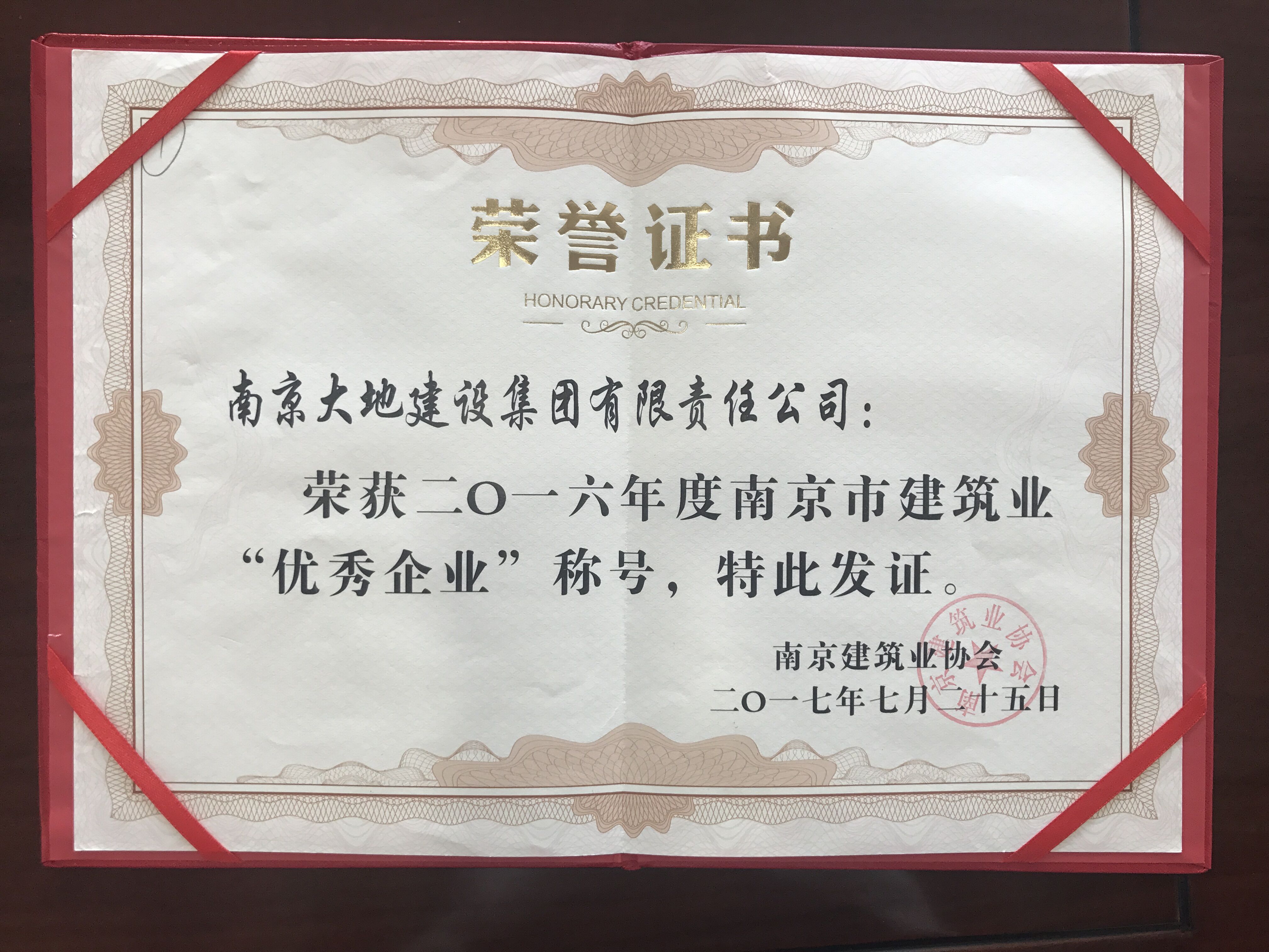 2017年8月25日,南京建筑業(yè)協(xié)會七屆五次理事會暨2017年度表彰大會在省會議中心召開,表彰主動適應(yīng)新常態(tài),推動行業(yè)新發(fā)展,為加強(qiáng)南京市建筑業(yè)企業(yè)品牌建設(shè)做出貢獻(xiàn)的企業(yè)和企業(yè)經(jīng)理。南京大地建設(shè)集團(tuán)有限責(zé)任公司和南京大地建設(shè)(集團(tuán))股份有限公司被雙雙授予2016年度南京市建筑業(yè)“優(yōu)秀企業(yè)”榮譽稱號,集團(tuán)公司副董事長于春榮獲南京市建筑業(yè)“優(yōu)秀企業(yè)經(jīng)理”榮譽稱號。南京大地建設(shè)(集團(tuán))股份有限公司榮獲7項“金陵杯”獎。