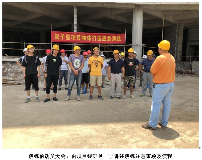2018年安全生產(chǎn)月以來,雙子星項目部積極開展各項安全生產(chǎn)月活動。近日,雙子星項目部組織了物體打擊事故應(yīng)急救援預(yù)案演練。整個演練活動快速、有效,演練過程緊張有序。通過本次演練,不僅檢驗了項目部的應(yīng)急反應(yīng)及處理能力,也更進(jìn)一步增強了高效有序處理意外事故的能力。