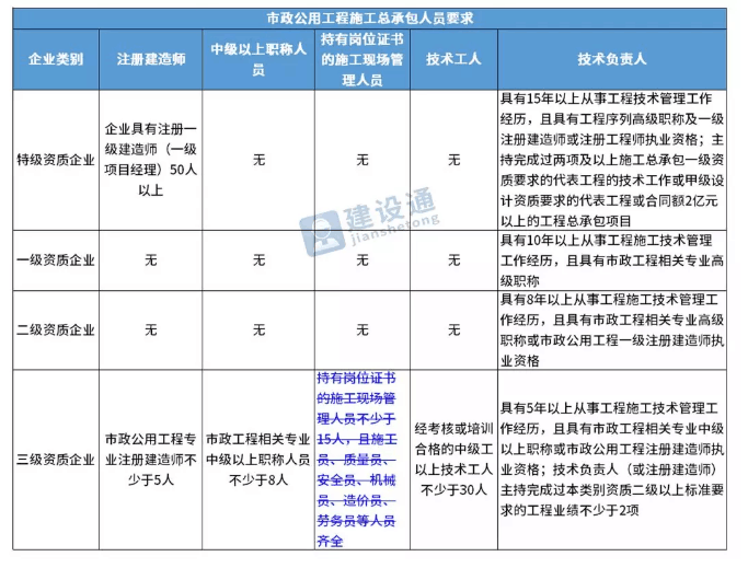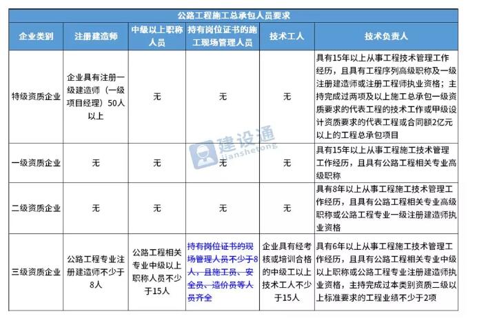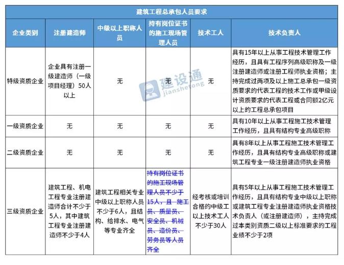 換句話說,并不是所有企業(yè)資質(zhì)都不要求有建造師等企業(yè)人員。施工總承包三級資質(zhì)企業(yè)對建造師等人員仍有要求,一級資質(zhì)、二級資質(zhì)企業(yè)保留技術(shù)負責人這一項要求,特級資質(zhì)另有規(guī)定。