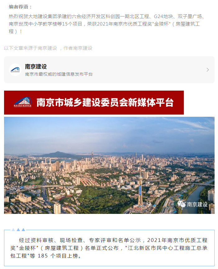 2021年南京市優(yōu)質(zhì)工程獎"金陵杯"(房建)名單出爐