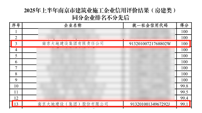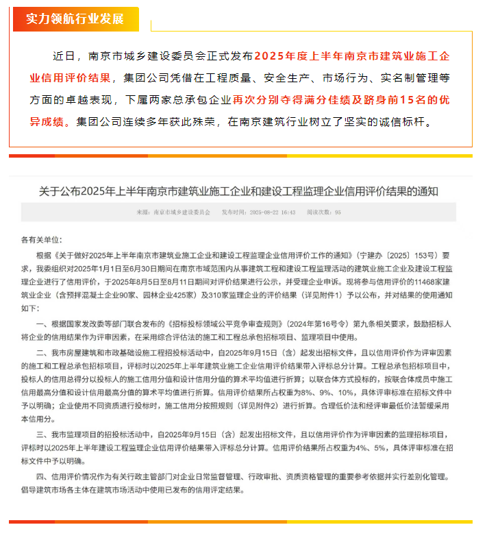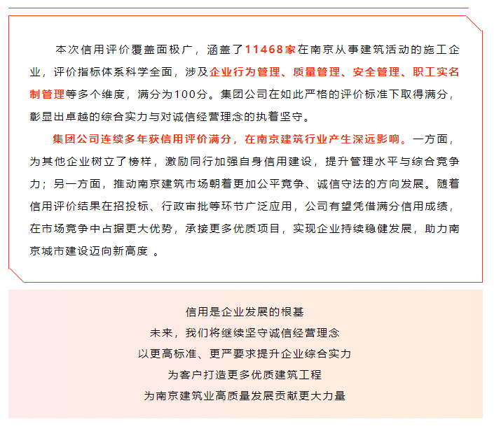 集團(tuán)再獲南京市建筑業(yè)施工企業(yè)信用評價(jià)滿分